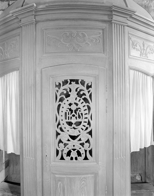 Confessionnaux posés sur emmarchements à pans galbés. Chêne ou châtaignier ; panneaux, moulures petit cadre et plate-bande ; coupes mixtes.