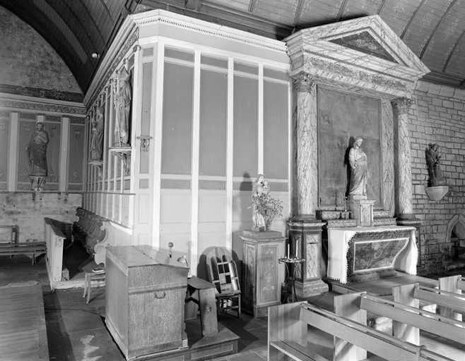 Autel de plan rectangulaire à élévation galbée surmonté d'un tabernacle et de deux gradins ; retable à deux colonnes surmonté d'un fronton triangulaire.