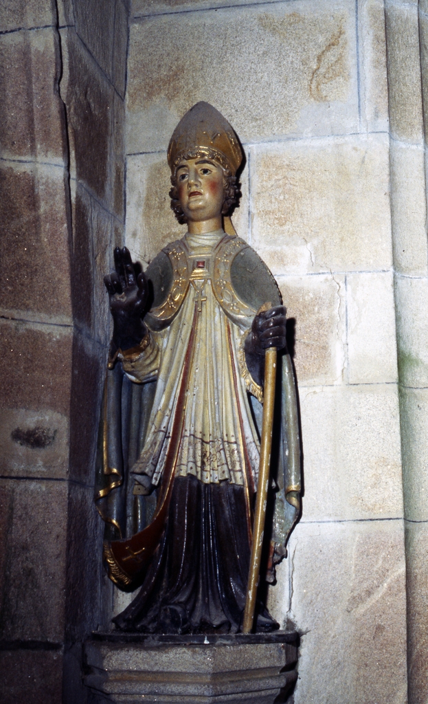 Statue (petite nature) : saint évêque (2), église paroissiale Saint-Budoc ou Notre-Dame de la Clarté (Beuzec-Cap-Sizun),
