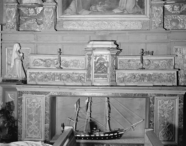 Ensemble du 18e siècle avec quelques remplois de reliefs du milieu du 17e siècle (?) associant un autel, un retable, deux gradins et un tabernacle dont le battant en remploi reproduit inversé, d'après une gravure de Boulanger, une Vierge à l'Enfant de Mignard.