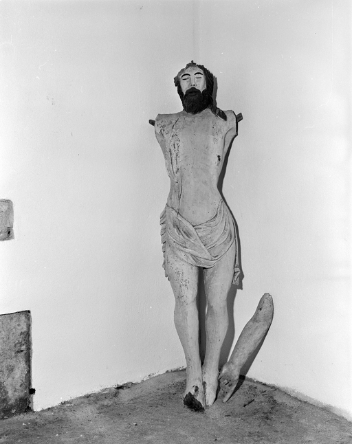Manque la croix, le bras gauche, le haut de la tête ; bout du pied droit et bras droit déposés ; vermoulures, fentes.