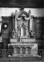 Retable en bois avec niche centrale à entablement curviligne reposant sur degrés d'autel ornés de motifs végétaux sur un autel en granit.