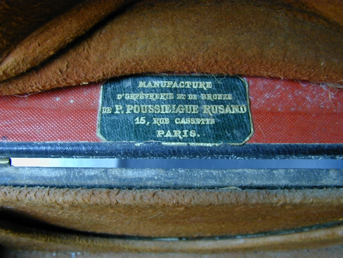 L'objet à été fabriqué dans l'atelier parisien Poussielgue Rusand à la fin du 19e siècle. La boîte d'origine en bois doublée de cuir et garnie d'une peau de chamois porte la marque de l'atelier.