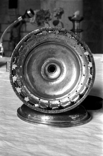 Poinçons (sous le pied) : initiales M et B séparées par un point, dans un cadre rectangulaire, maître Mathurin Boullemer ; communauté de Rennes année 1661, hermine passante, lettre R au dessus, et lettre M au dessous. Inscription, gravée sous la bordure du pied : C'EST LE VOEU DE NOB FRANCOISE DE CHASTEAUNEUF DAME DU LEVZRE L'AN1661 POUR TREGOUREZ M GUEGVVEN R.