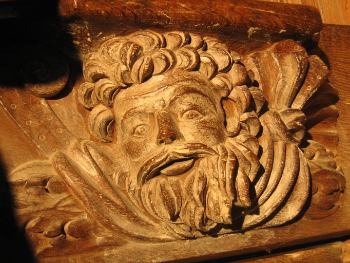 Sur la miséricorde : un homme est représenté en buste, tourné vers sa droite. Il est barbu, les cheveux courts et bouclés, et porte une sorte de toge, nouée sur l'épaule gauche et dont l'extrémité flotte derrière lui. Ses bras ont été remplacés par des feuillages. Il lève les sourcils et son front est barré d'une grande ride. Une arabesque s'enroule derrière lui, au-dessus de son épaule droite.