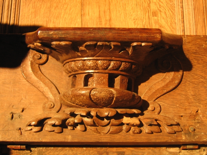 - chêne, taillé, mouluré, ciré, décor en bas-relief, décor en demi-relief