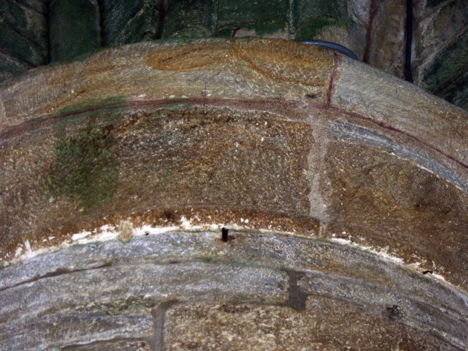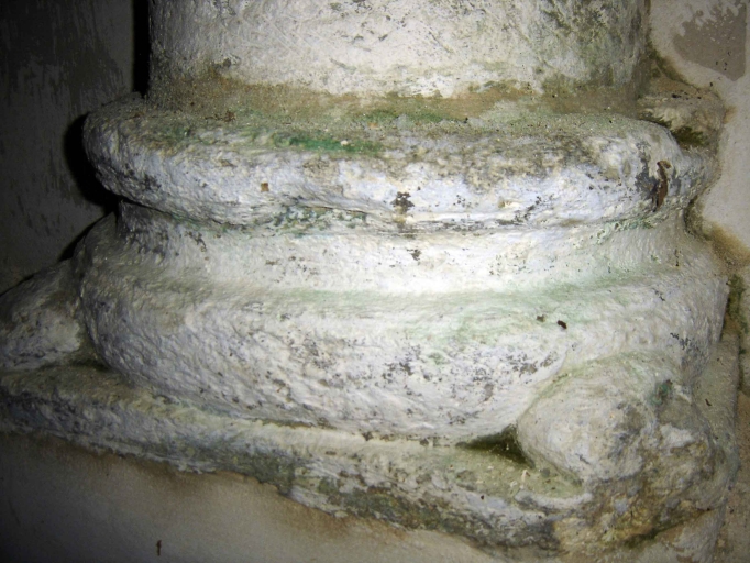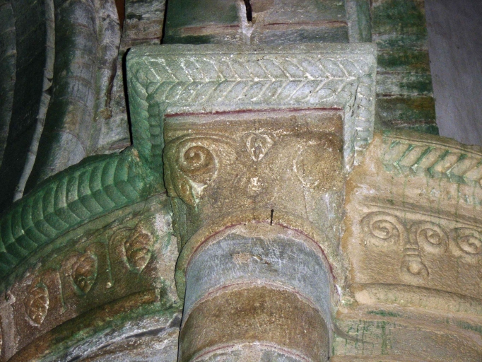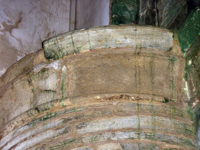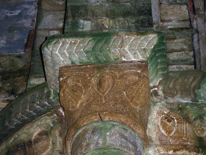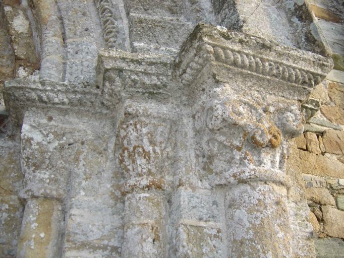 Les chapiteaux situés à l'extérieur de l'édifice sont particulièrement érodés et l'ancien tympan quasi-illisible, les chapiteaux de l'intérieur de l'édifice sont en granit qui s'oxyde ce qui leur donne une teinte verdâtre.