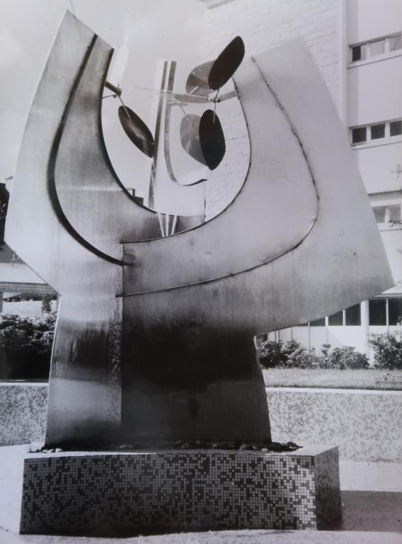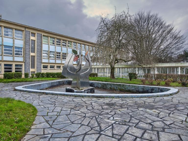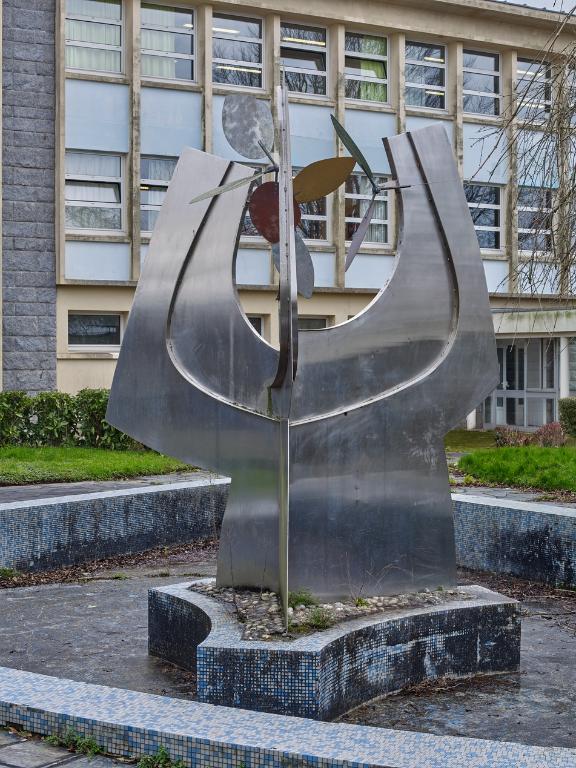 Par-delà la qualité plastique de cette sculpture et son originalité parmi les décorations au titre du 1% artistique dans les lycées bretons, cette œuvre est également intéressante par son rapport à l'architecture, lequel a cependant a été modifié au fil du temps. La "fontaine mobile" prend en effet place au centre d'un bassin recouvert de mosaïque et d'un espace pensés par l’architecte qu’il présente lui-même comme étant "au centre des activités du lycée". Cet ensemble est très dessiné, au milieu d'un paysage de barres scolaires très normées. Le traitement des sols alterne végétal et minéral. Différents matériaux sont présents : ardoise, carreaux de grès, galets et inox, in fine. Notons que le bassin est achevé vers 1967, antérieurement au choix de l'artiste, mais que le socle de la sculpture est lié à l'œuvre. Une photographie prise peu après la réception de l'oeuvre montre le fonctionnement des jets d'eau.