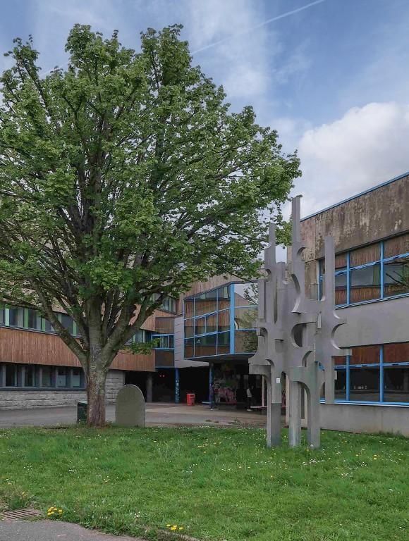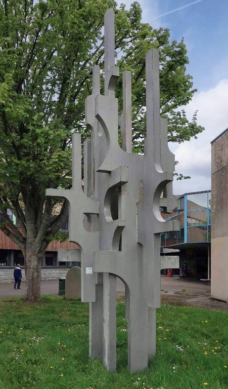 "Sur une pelouse située à l'est de l'établissement, entre le bâtiment des ateliers et celui de l'internat des filles, une sculpture en tôle d'aluminium de 3/10e d'épaisseur. Elle serait fixée sur un socle en béton enfoui dans le sol.