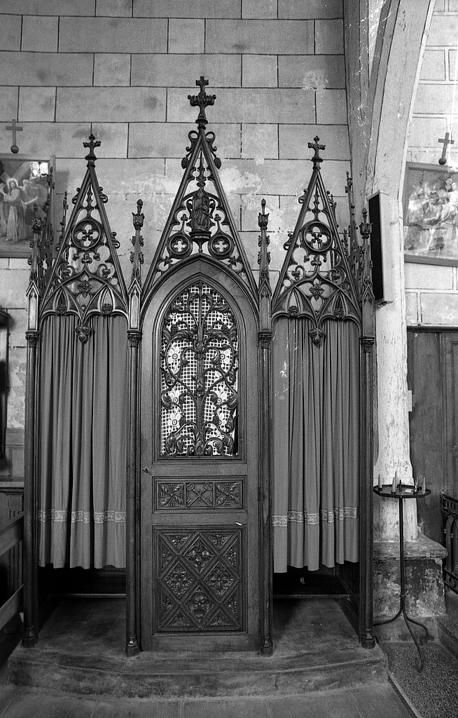 Confessionnal, style néo-gothique, prieuré Notre-Dame, église paroissiale de chanoines réguliers de Saint-Augustin (Arbrissel),