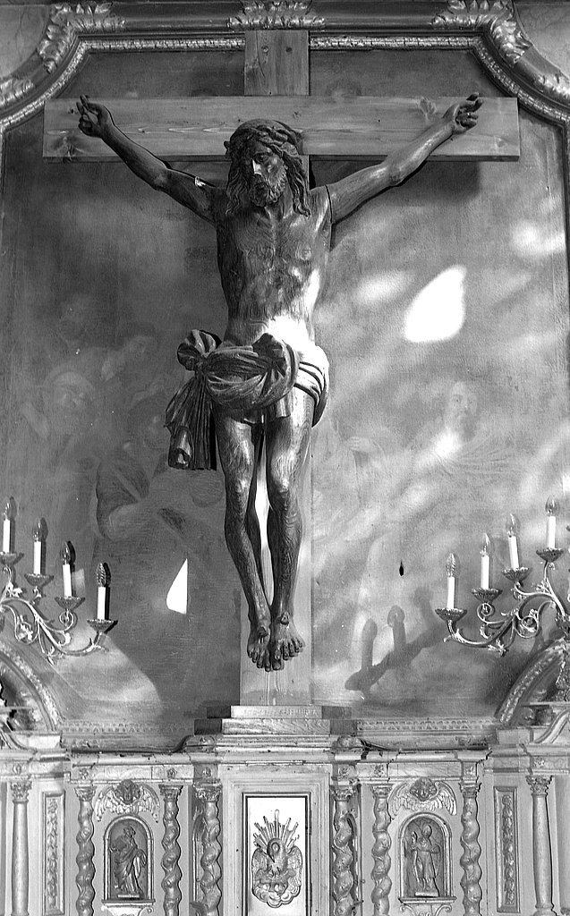 Christ en croix en bois ; statues saint Pierre, saint Paul et saint Ouen (?) en plâtre.