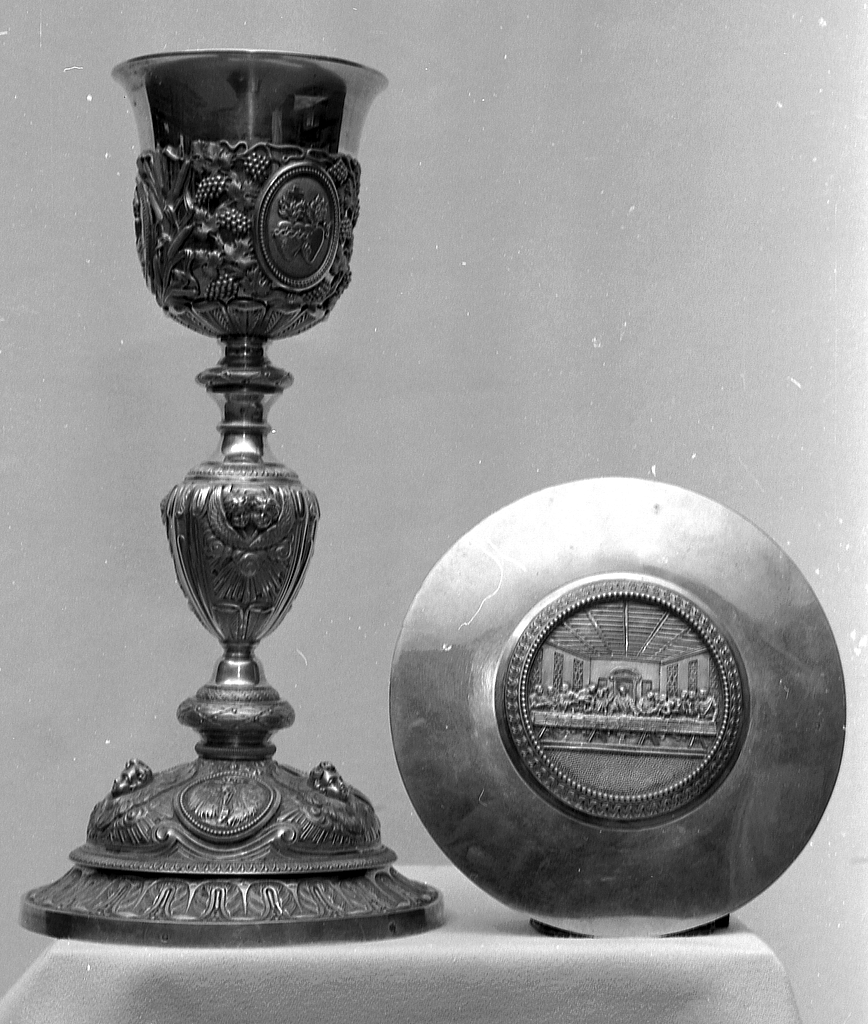 La cène sur patène ; coeurs enflammés sur fausse coupe ; couronne et bon pasteur sur fausse coupe.