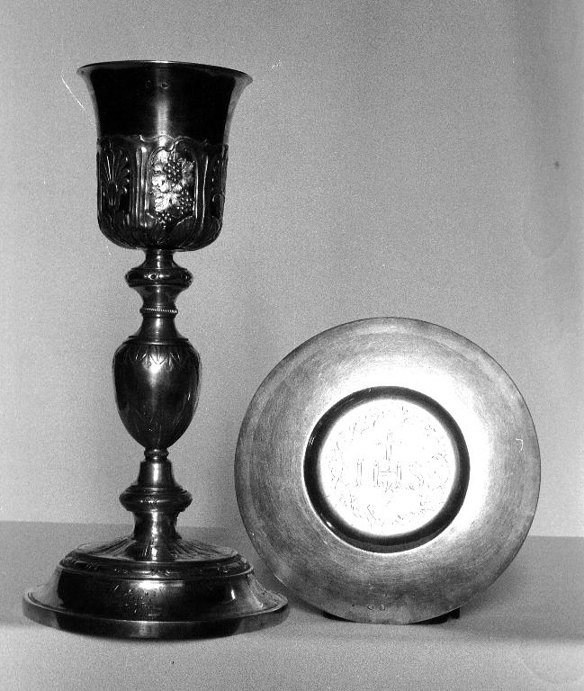 Ensemble composite constitué d' un calice réalisé à Paris par l'orfèvre Edme Gelez et d'une patène réalisée par l'orfèvre Jean Loque entre 1818 et 1838.