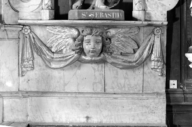 - ornementation, angelot, draperie, rinceaux chapiteau corinthien, aileron, tête