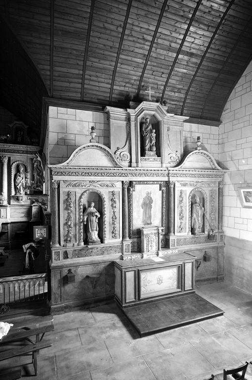 Retable à trois travées sur soubassement ; niche de couronnement dans l'axe ; frontons chantournés surmontant les travées latérales délimitées par quatre colonnes ; autel à élévation droite.