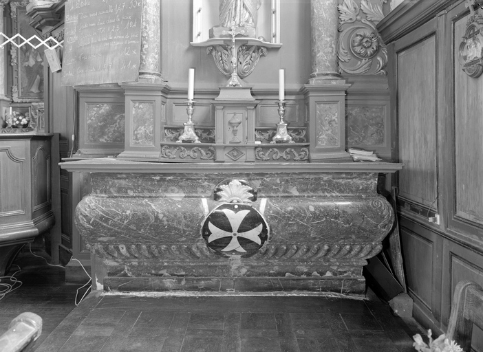 La porte du tabernacle est ornée d' un ciboire, le devant de l'autel nord porte un triangle mystique, celui du sud une croix de malte surmontée d' une palmette.
