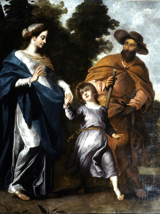 - scène: Sainte Famille, Vierge, Enfant Jésus, saint Joseph fond de paysage, la marche