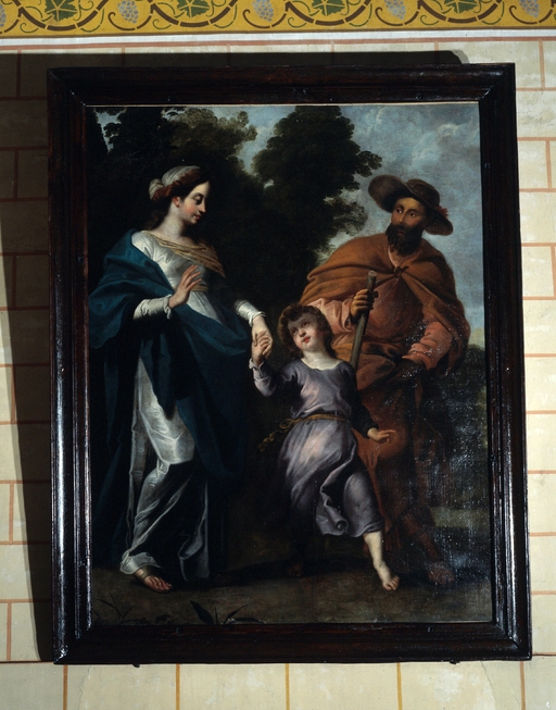 Ancien STRU : cadre rapporté ; rectangulaire vertical. Ancien REPR : scène : Sainte Famille (fond de paysage, la marche : Vierge, Enfant Jésus, saint Joseph : pélerin.