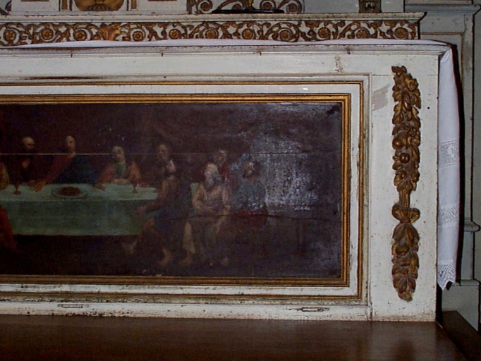 Devant d'autel à cadre mobile maintenu par 2 gonds et 2 crochets de fer, datant de la 2e moitié du 17e siècle.