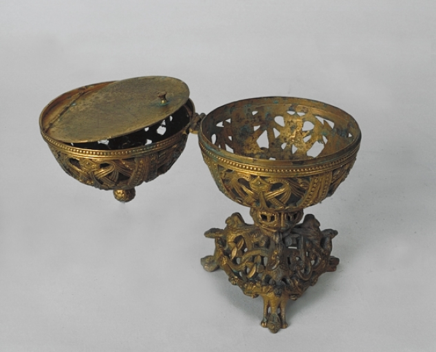 Ce brûle-parfum présente de nombreuses analogies avec celui inscrit au catalogue de Poussielgue-Rusand sous le numéro 617 ; ce dernier dérive d'un modèle d'encensoir de la fin du 12e siècle présenté par Viollet-le-Duc et Didron en 1846, auquel Poussielgue-Rusand ajouta un pied triangulaire formé par des animaux fantastiques de sa création.