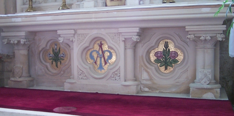 Le dessin de cet ensemble est attribué à Arthur Regnault, architecte de l'édifice ; des plans de l'autel (fondation des murs de la chapelle) sont datés 1897 tandis que l'exécution semble avoir été réalisée en 1898. Le sculpteur rennais Tigeot est vraisemblablement l'auteur des deux reliefs latéraux, tandis que les mosaïques sont attribuées à Odorico. Cette oeuvre fut offerte par la famille Le Fer de la Gervinais du Pomphily.