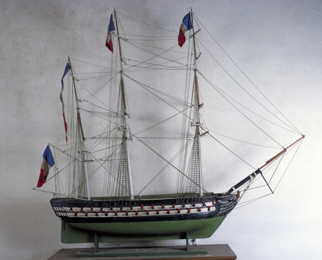 Maquette de frégate polychrome en bois et cordages, armée de 60 canons. La figure de proue représente un moine bénissant en rapport avec le nom "Saint-Briac" inscrit sur la maquette. Le modèle exact n'a pas été identifié. Il pourrait s'agir d'une frégate fictive, inspirée par les modèles les plus novateurs de la période.