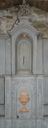 Il manque la table d'autel. Plusieurs fentes dans le tabernacle, dont la porte est piquée. Le devant d'autel est constitué d'une porte d'armoire, montée sur les fiches. La frise au-dessus du retable manque ; les amortissements ne sont pas tous en place.