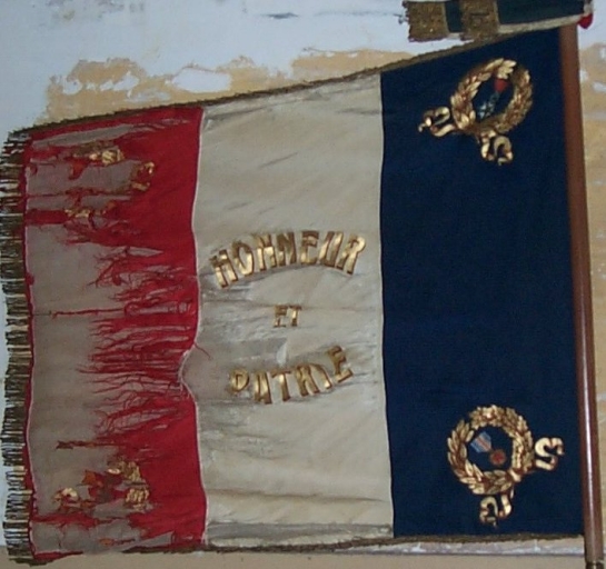 Inscription sur la face : U. N. C. / SECTION / 1914 / DE ST-MALO-DE / "I.-et- V. " ; sur le revers : HONNEUR / ET / PATRIE. Sur la hampe, une étiquette métallique gravée : DRAPEAUX / Soie, Laine, Coton / BANNIERES / - & - / INSIGNES de SOCIETES / Ad. Robert / Fabricant / TAIN-L'HERMITAGE / (DROME).