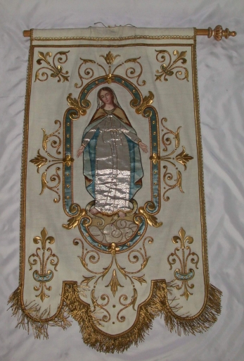 Bannière de procession : Immaculée Conception : soie (blanche) : tissu façonné, application sur textile, adjonction d´éléments ; soie : satin, brodé ; toile (support) : peint, polychrome ; fil métal : doré, argenté. Inscription : A M. 1er quart 20e siècle. Fig. 24 et 25.