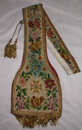 Etole pastorale : toile (support) : tapisserie au point, application sur textile ; fil métal : doré. Limite 19e siècle 20e siècle. Représentation : croix ; fleurs au naturel. Fig. 32.
