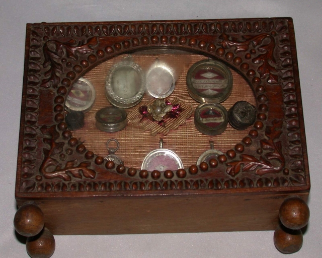 Reliquaire : bois : mouluré, décor méplat, teinté, vernis ; argent (?) : fonte ; 10,5 l ; 15 la. 14 médaillons. Limite 19e siècle 20e siècle. Fig. 10.