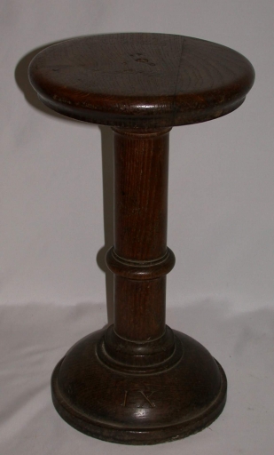 4 Tabourets d'église : chêne : mouluré, tourné, gravé, teinté, vernis ; 43,5 h. Vermoulure. Chiffres romains gravés sur le pied : IV, V, VI, IX. 4e quart 19e siècle. Fig. 6.
