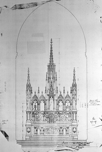 Maître-autel, étude de la partie médiane (1er retable), variante avec les arcatures décoratives. Plan, attribué à Arthur Regnault, [s.d.]. (A.D. Ille-et-Vilaine).