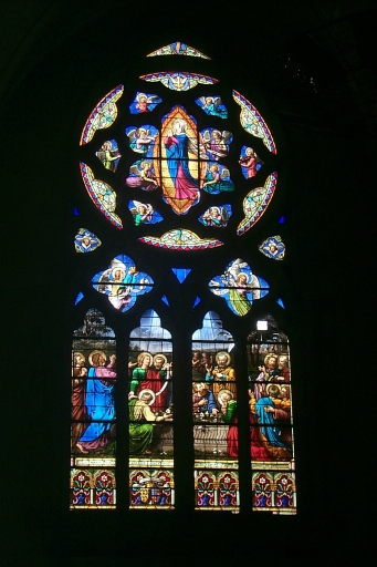 Ensemble des verrières à personnages des baie 117 et 118 : Assomption, scènes de la vie de saint Joseph,