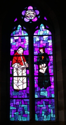 Signature dans les verrières des baies 26 : R B, et 29 : Robert Briand : Rennes. Inscription sous chaque personnage et dans les petites roses. Baie 20 : Bx Julien MAUNOIR / Saint LM GRIGNON de Montfort. Baie 22 : Sainte BERNADETTE / Sainte Maria GORETTI / armoiries de Paul VI. Baie 23 : St Dominique SAVIO / St Jean EUDES / SSts Coeurs de Jésus et Marie. Baie 24 : Saint CURE D´ARS / saint PIE X. Baie 25 : Sainte THERESE de l´enfant JESUS / Sainte JEANNE D´ARC / armoiries et devise (IN SPIRITU ET VERITATE) de l´évêque de Rennes, Mgr Gouyon (?). Baie 26 : CELUI QUI CROIT EN MOI N´AURA PAS FAIM / ET CELUI QUI CROIRA EN MOI N´AURA JAMAIS SOIF. Baie 27 : JEAN XXIII / J M DE LAMENNAIS / FRERES de PLOËRMEL ; FILLES DE LA PROVIDENCE. Baie 29 : et il poursuivait son chemin tout à la joie.