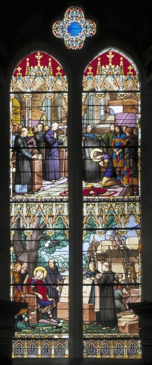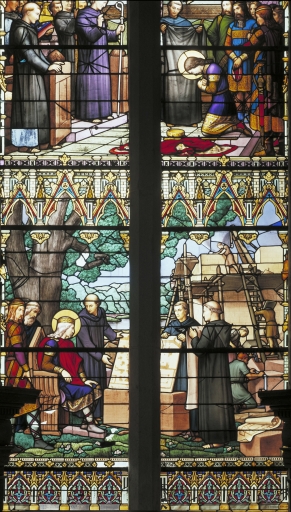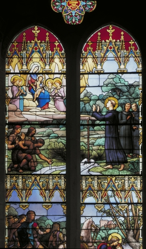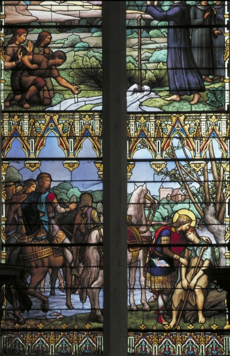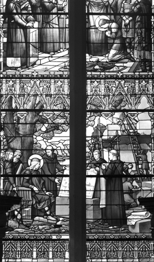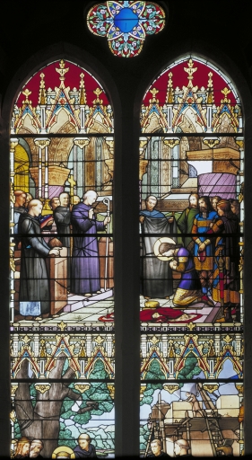 Les grisailles sont de type classique, de bonne qualité en ce sens que le dessin en est léger. Les verrières historiées, bien représentatives de l'atelier rémois Vermonet, se signalent par la finesse du dessin, la recherche de la mise en plomb, la variété des couleurs utilisant une gamme fondue plutôt que heurtée ; quelques accents rouges viennent relever les bleus et verts (verrière 1) ou les bruns dominants des bures (verrière 2). Le traitement de la végétation évoque discrètement l'Art Nouveau.