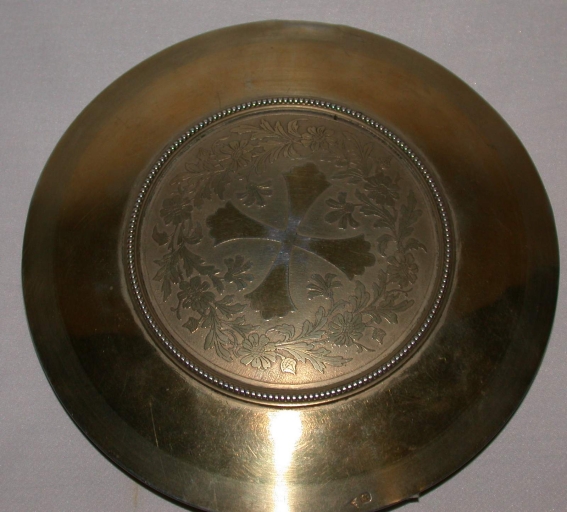 La dorure est usée ; la patène est bosselée.