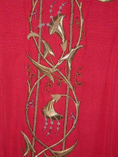 Ornement rouge 1 : chasuble, bourse de corporal, étole, manipule, voile de calice,