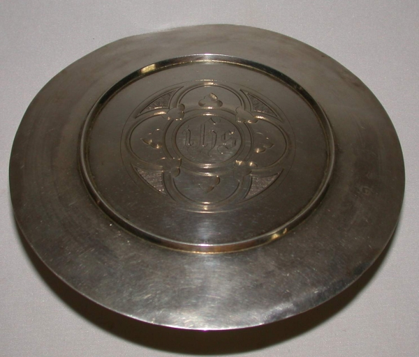 Les deux poinçons sont sur la coupe, sur le pied et sur la patène. Marque tissée sur étiquette dans la boîte : MAISON E. EVELLIN / [losange horizontal, lettres E E séparées par une hermine] / RENNES / Rue d´Antrain.