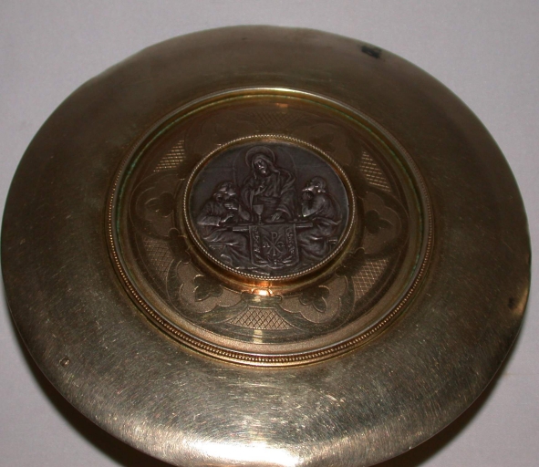 Le calice et la patène ont été réalisés par l'orfèvre lyonnais Henri Nesme et vendu par le marchand rennais Emile Evellin ; un certificat de consécration portant la date de 1933 est conservé dans la boîte.