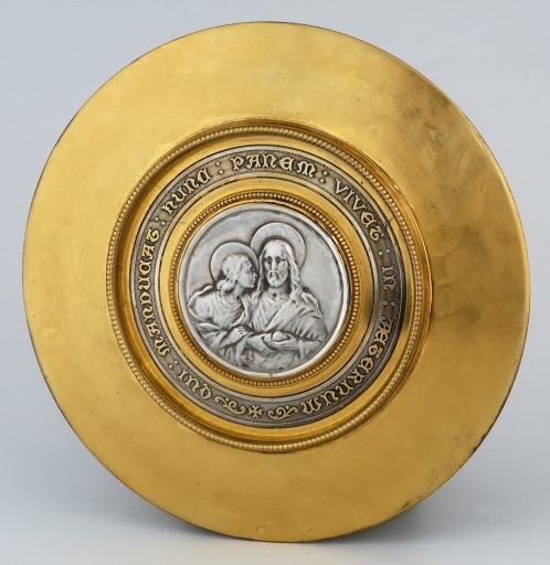 Les deux poinçons sont sur la coupe, sur le pied et sur la patène. Poinçon de fabricant : losange vertical, lettres A M séparées par une abeille sur une flèche. Inscription sur la patène : QUI MANDUCAT HUNC PANEM VIVET IN AETERNUM [QUI MANGE CE PAIN VIVRA ETERNELLEMENT].