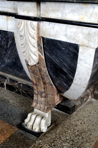 - marbre veiné, rose, noir, blanc mouluré, décor dans la masse, décor rapporté, décor en demi relief