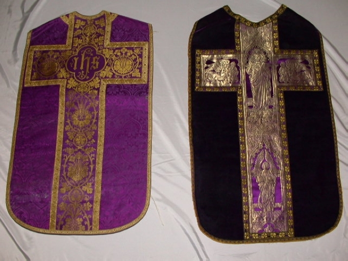 Ornement violet 2 : Chasuble, étole, manipule, bourse : soie (violette) : velours uni, application sur textile. Limite 19e siècle 20e siècle. Représentation : sacré coeur ; anges ; alpha ; oméga. Fig. 33.