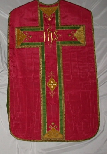Ornement rouge : Chasuble, bourse de corporal, manipule, voile de calice : soie (rouge) : faille française, moirée ; fil métal : doré. Oeuvre déposée. Limite 19e siècle 20e siècle. Fig. 31.