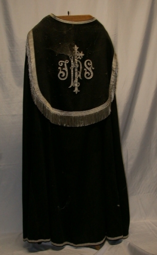 Chape noire : soie (noire) : faille française, application sur textile ; fil métal : argenté. Oeuvre déposée. 1er quart 20e siècle. Représentation : I.HS.. Fig. 24.