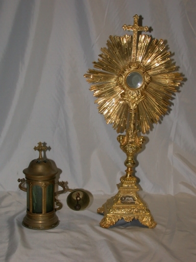 Ostensoir : métal : fondu, doré, ciselé au trait ; 60 h. 4e quart 19e siècle. Représentation : angelots ; rayons ; agneau aux sept sceaux ; triangle ; blé ; vigne. 2e moitié 19e siècle. Fig. 16.
