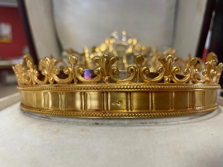 La couronne ouverte de la Vierge se caractérise par une grande croix frontale ornée de pierres de couleur orangée. De part et d'autre, deux fleurons en forme d'hermine se déploient dans un élégant réseau de rinceaux.