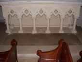 Devant d'autel : arcatures trilobées ; porte du tabernacle : croix, rinceaux ; gradin et retable : rinceaux de vigne.