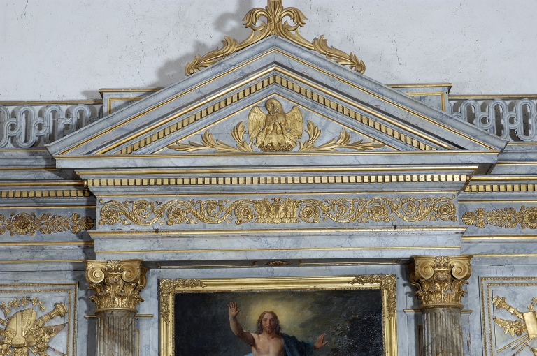 Retable : Pélican mystique dans le fronton, pots à feu au sommet des colonnes latérales ; rinceaux sur la frise ; panoplies d'objets religieux au-dessus de chaque niche. Tabernacle : angelot sur les ailes, croix sur la porte. Devant d'autel : Agneau aux sept sceaux encadré de palmes.