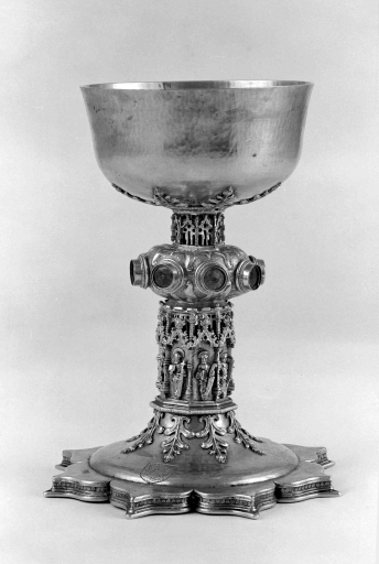 Pied à huit lobes en accolade. Base de la tige avec arcatures gothiques abritant des figurines d'apôtres. Noeud à flammes et rayons.